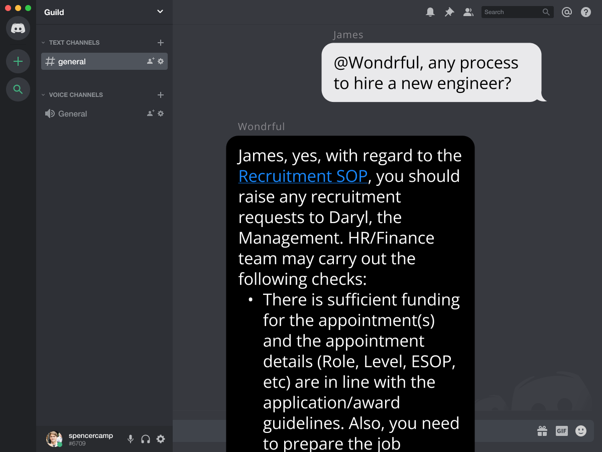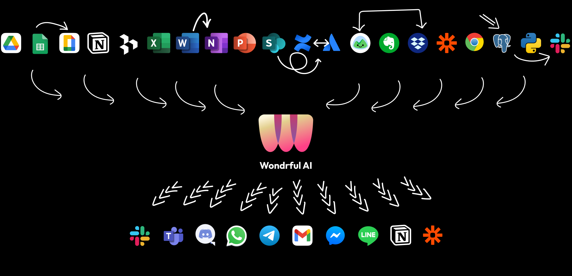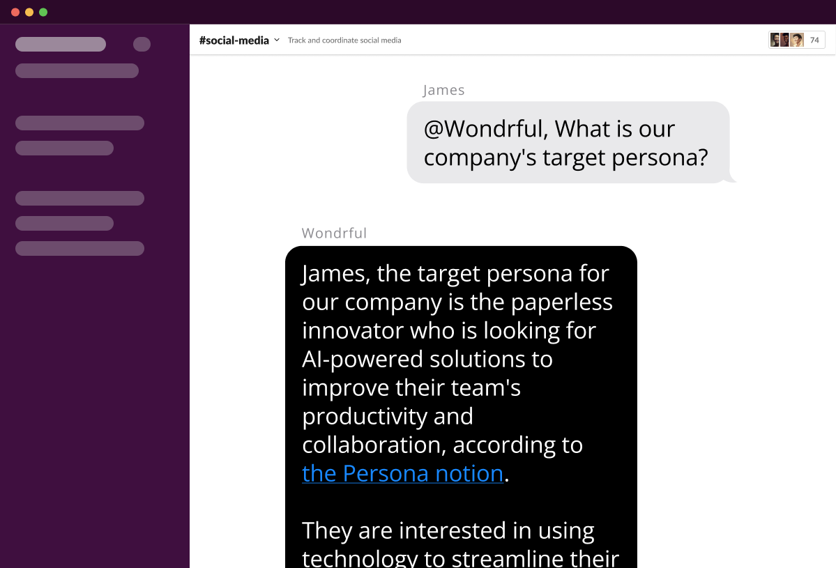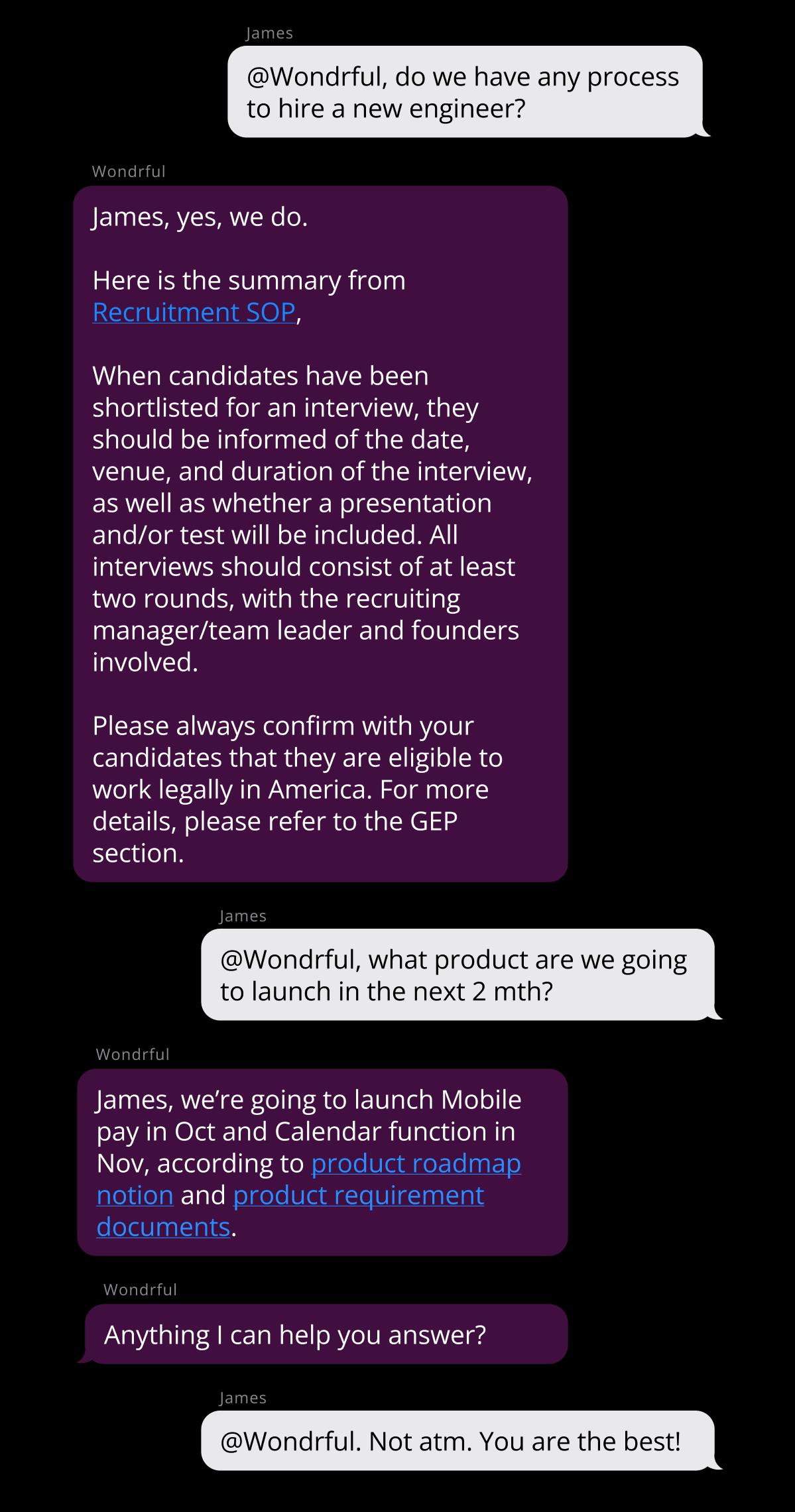The Wondrful® AI solution helps your team find your company knowledge and solve problems in seconds, all inside any chat apps like Slack / Discord / more.